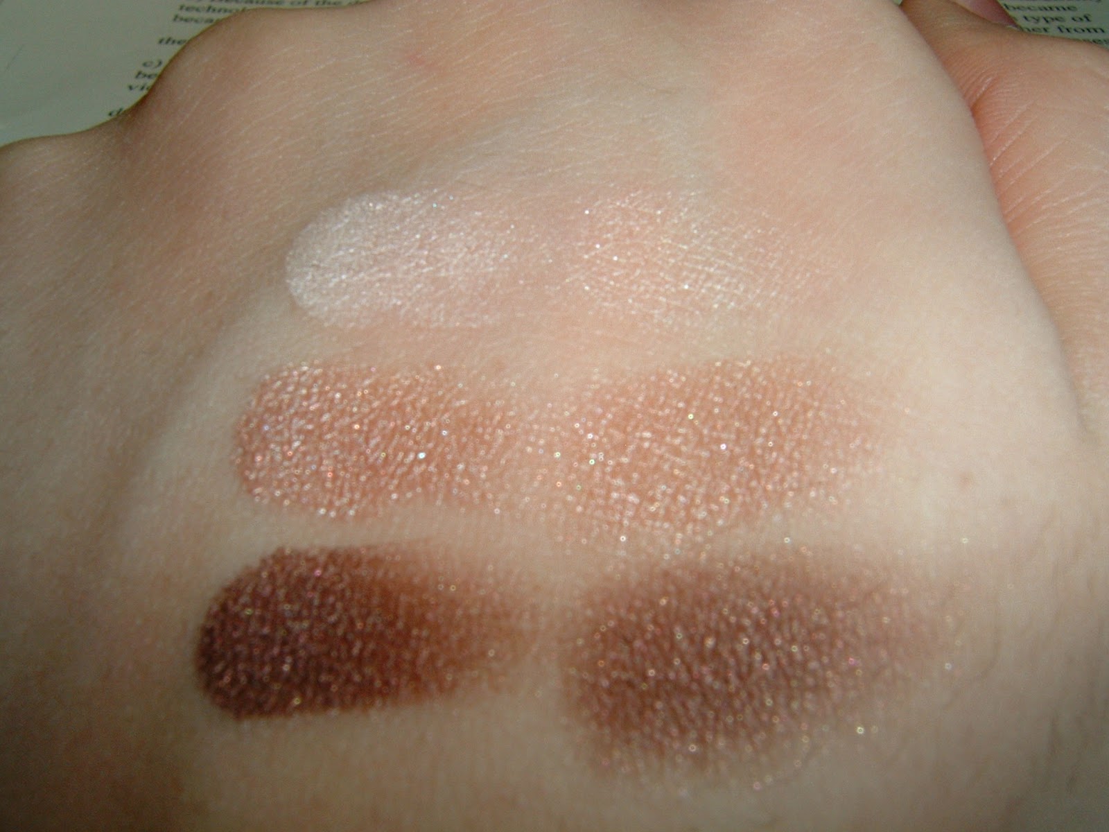 This little palette has been a staple in my makeup.. Although, I don't use makeup very often and when I do I always find myself using these as my base eyeshadows. I usually put the light peach color in my inner 1/3 of my lid, the peachy gold on the rest 2/3 of lid, and the bronzey brown in my outer-v blending it into the peachy gold. Although, the creme eyeshadows alone create a great neutral look, I like to layer some eye shadow over them to make them stand out more.